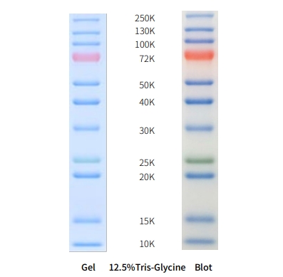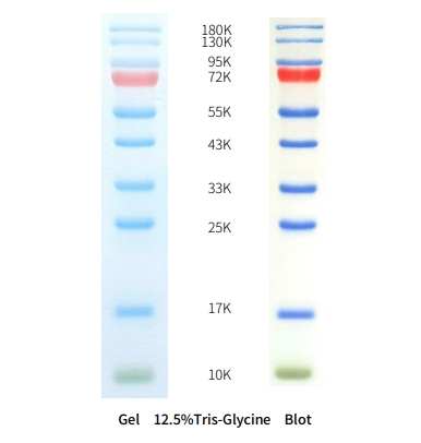 Pre stained proteins have different apparent molecular weights in different buffer systems, and the above two images are electrophoresis diagrams under two different buffer systems. Suitable as a protein molecular weight standard for SDS-PAGE and Western Blot. Can be used as a reference for protein molecular weight size in SDS-PAGE and Western Blot experiments.