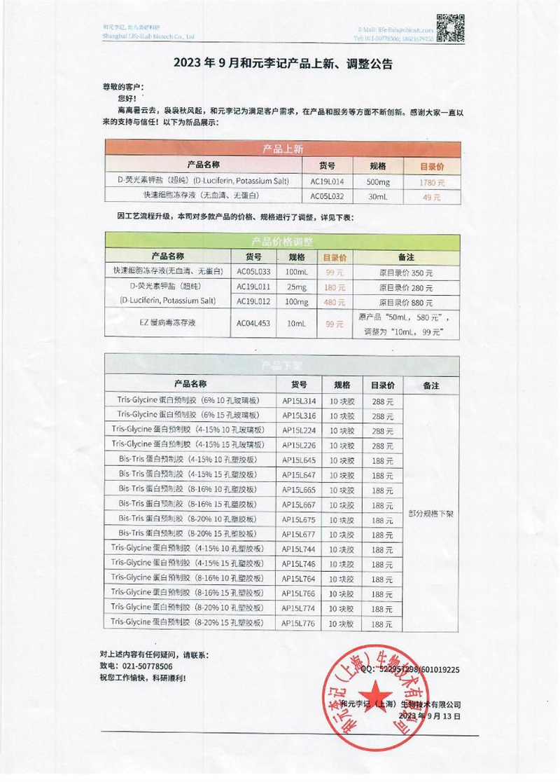 2023年9月和元李记产品上新、调整公告