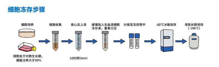 A:冷存管置于4℃-10分钟→→→ -20℃-30分钟→→→ -80℃-16~18小时(或隔夜)→→→液氮罐长期储存。-20℃不可超过1小时,以防止冰晶过大,造成细胞大量死亡,亦可跳过此步骤直接放入-80℃冰箱中,惟存活率稍微降低一些。