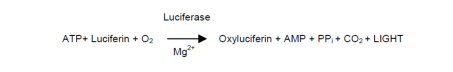 在支原体裂解后,该支原体特异性的酶,在底物存在下,具有将ADP转化成ATP的功能。由于荧光素酶(Luciferase)催化底物荧光素(Luciferin)产生光的反应需要ATP的参与,支原体特异性酶催化产生的ATP含量,可以通过该反应转化成生物发光(Bioluminescence)信号,该信号可以使用专门的发光检测仪(Luminometer)或具有发光检测功能的多功能酶标仪进行检测,发光的强度与ATP的含量成正比。通过比较细胞培养上清和未用于细胞培养的培养液上清二者的支原体特异性酶的含量,即可知道培养的细胞是否被支原体污染。反应原理如下: