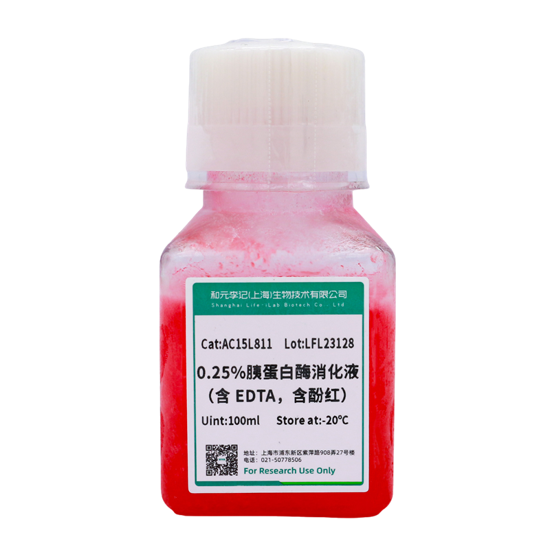 本产品含 0.25%胰蛋白酶,溶于 Hank’s 缓冲液,添加 0.9 mM EDTA,含酚红指示剂,经 0.22 μm 过滤除菌。