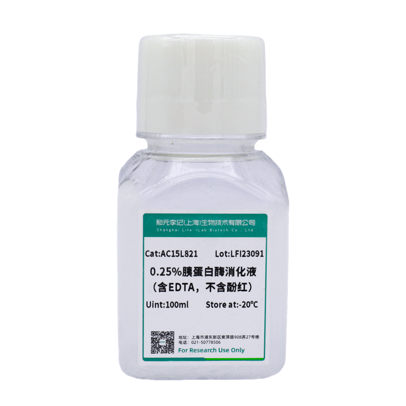 本产品含 0.25%胰蛋白酶,溶于 Hank’s 缓冲液,含 0.9 mM EDTA,无酚红指示剂,经 0.22 μm 过滤除菌。