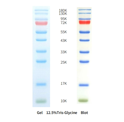 三色预染蛋白Marker(10-180KD)包含了10种高度纯化并预染的重组蛋白(10,17,25,33,43,55,72,95,130,180KD,均带His标签)。其中,72KD条带为橙红色,10KD为绿色,其余条带为蓝色,适合作为SDS-PAGE和Western Blot的蛋白质分子量标准。