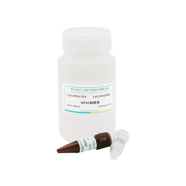 NP40裂解液是一种比较温和的细胞组织裂解液,主要成分为50 mM Tris(pH7.4),150 mM NaCl,1% NP-40以及sodium pyrophosphate,β-glycerophosphate,sodium orthovanadate,sodium fluoride,EDTA,leupeptin等多种抑制。对胞浆亚组分、胞核成分均有较强裂解作用,有利于胞浆蛋白、核蛋白、胞浆磷酸化蛋白及细胞核转录因子的提取。适用于常规的Western、IP和co-IP等实验蛋白样品的制备。
