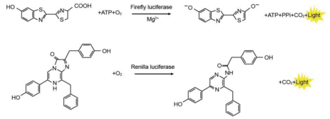 萤火虫萤光素酶是一种分子量约为 61 kD 的蛋白,在 ATP、镁离子和氧气存在的条件下,可以催化Luciferin 氧化成 Oxyluciferin,在 Luciferin 氧化的过程中,并伴随生物发光(Bioluminescence)。海肾萤光素酶是一种分子量约为 36 kD 的蛋白,在氧气存在的条件下,可以催化 Coelenterazine 氧化成Coelenteramide,在 Coelenterazine 氧化的过程中也伴随生物发光。生物发光是化学发光的一种形式,通过化学反应释放光能,可以通过化学发光仪(Luminometer)或液闪测定仪进行测定。